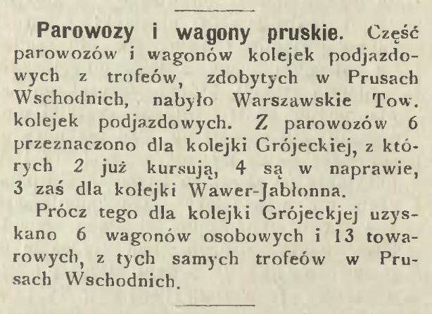 Korzystając z dobrodziejstw bibliotek cyfrowych udało się odnaleźć kilka ciekawych doniesień prasowych dotyczących taboru kolei warszawskich dojazdówek. Zacznijmy od ‘trofiejnego’ taboru z Prus Wschodnich (wiadomość z 1 lutego 1915 r. „Kurier Kolejowy i Asekuracyjny”):