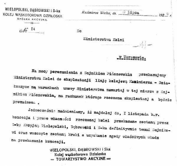 Poniżej fragment dokumentu z zasobu AP Pińczów, dotyczący budowy zwornika sieci – czyli Kolei Działoskiej: