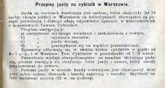 Przy okazji zupełnie znalazłem zupełnie niekolejowe „Przepisy jazdy na cyklach” (tj. rowerach). Niektórym warszawskich rowerzystom przydałby się taki egzamin! I mierna prędkość. :)