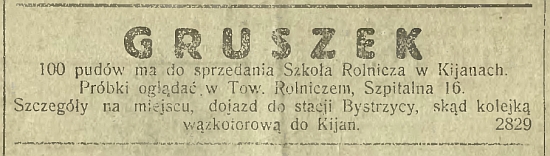 Kiedyś poszukiwałem dowodu na to czy kolejka wąskotorowa Bystrzyca – Łęczna kursowała także po odzyskaniu przez Polskę niepodległości. Otóż wydaje się że tak, a przyczynek do rozwiązania tej zagadki znalazłem w ogłoszeniu sadowniczym z listopada roku 1919: