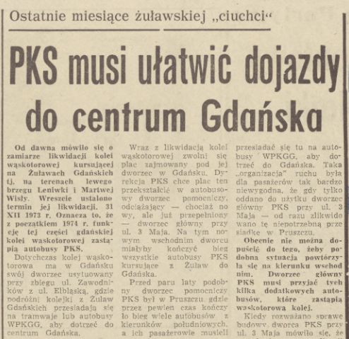 47 lat temu Dziennik Bałtycki, w wydaniu nr 224 z dnia 21 września 1973 r. donosił o określeniu terminu zamknięcia lewobrzeżnej części Kolei Żuławskiej na dzień 31 grudnia tegoż roku. Termin ten został dochowany, choć fizyczna likwidacja trwała jeszcze przez 2 lata. W artykule uwagę zwraca problem przedsiębiorstwa PKS które zdaje się jeszcze na 3 miesiące przed "ostatecznym terminem" nie miało pomysłu jak zorganizować pracę przejmowaną po kolei wąskotorowej. Likwidacja połączenia kolejowego na "nowocześniejsze" autobusowe nie przynosiła korzyści. Konieczność przesiadki pozostała.